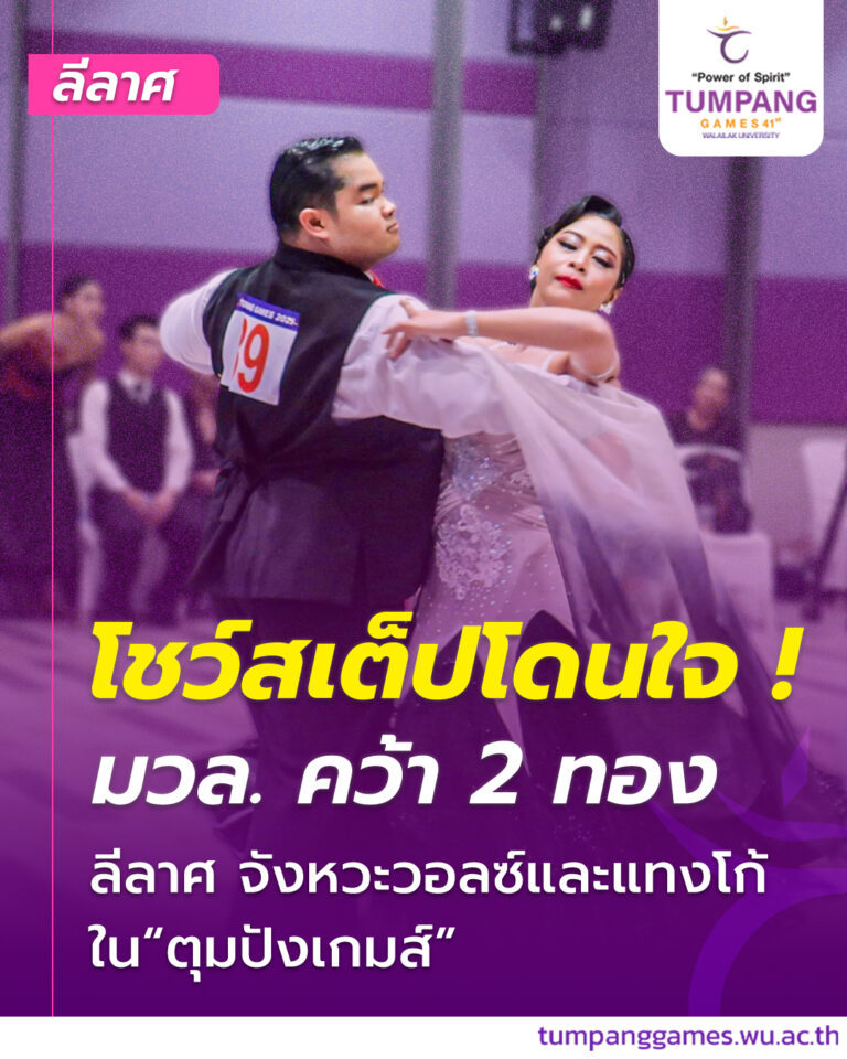 ขอแสดงความยินดีกับ อาจารย์ว่าที่ร้อยตรี วรวิทย์ ประดิษฐการ สำนักวิชาครุศาสตร์ และรศ.ดร.ลักษณ์นารา ขวัญชุม สำนักวิชาการจัดการ จากมหาวิทยาลัยวลัยลักษณ์ โชว์ผลงานโดดเด่น คว้า 2 เหรียญทอง ลีลาศรุ่นทั่วไป ประเภท สแตนดาร์ด ในจังหวะวอลซ์ และ จังหวะแทงโก้ ในกิจกรรม “ตุมปังเกมส์”